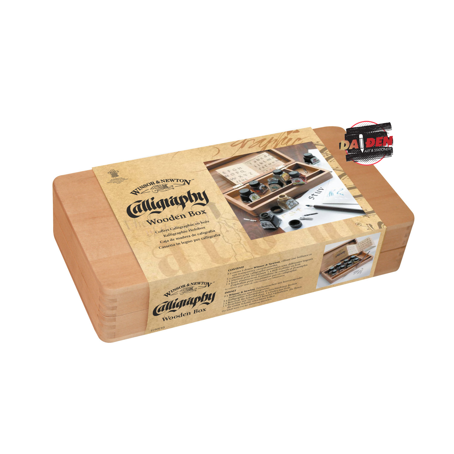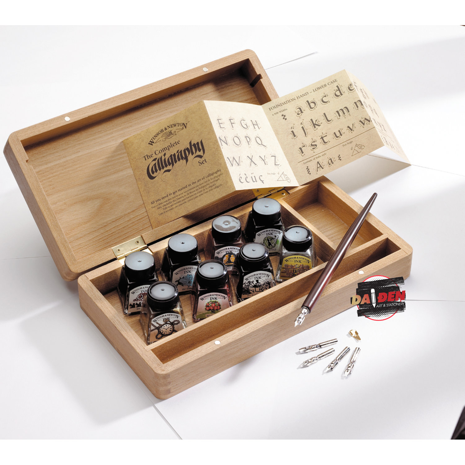 Bộ gồm: 5 x ngòi thư pháp với kích cở khác nhau, 1 x quản gỗ, 1 x tờ rơi hướng dẫn, mực vẽ 8 x 14ml: Vàng Canary, Đỏ tươi, Cobalt, Viridian, Nut Brown, Đen , Bạc, Vàng