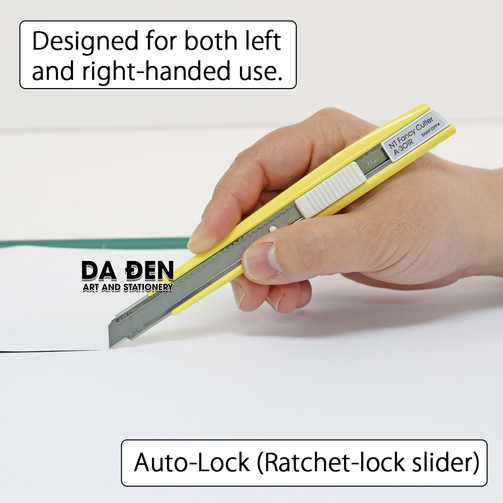 Dao NT A-301GR Cutter Japan lưỡi dao nhỏ ngang 9mm thân dao bằng nhựa với nhiều màu sắc - tay cầm chắc chắn không trơn trược. Dao có thể dành cho người dùng tay trái và tay phải.
