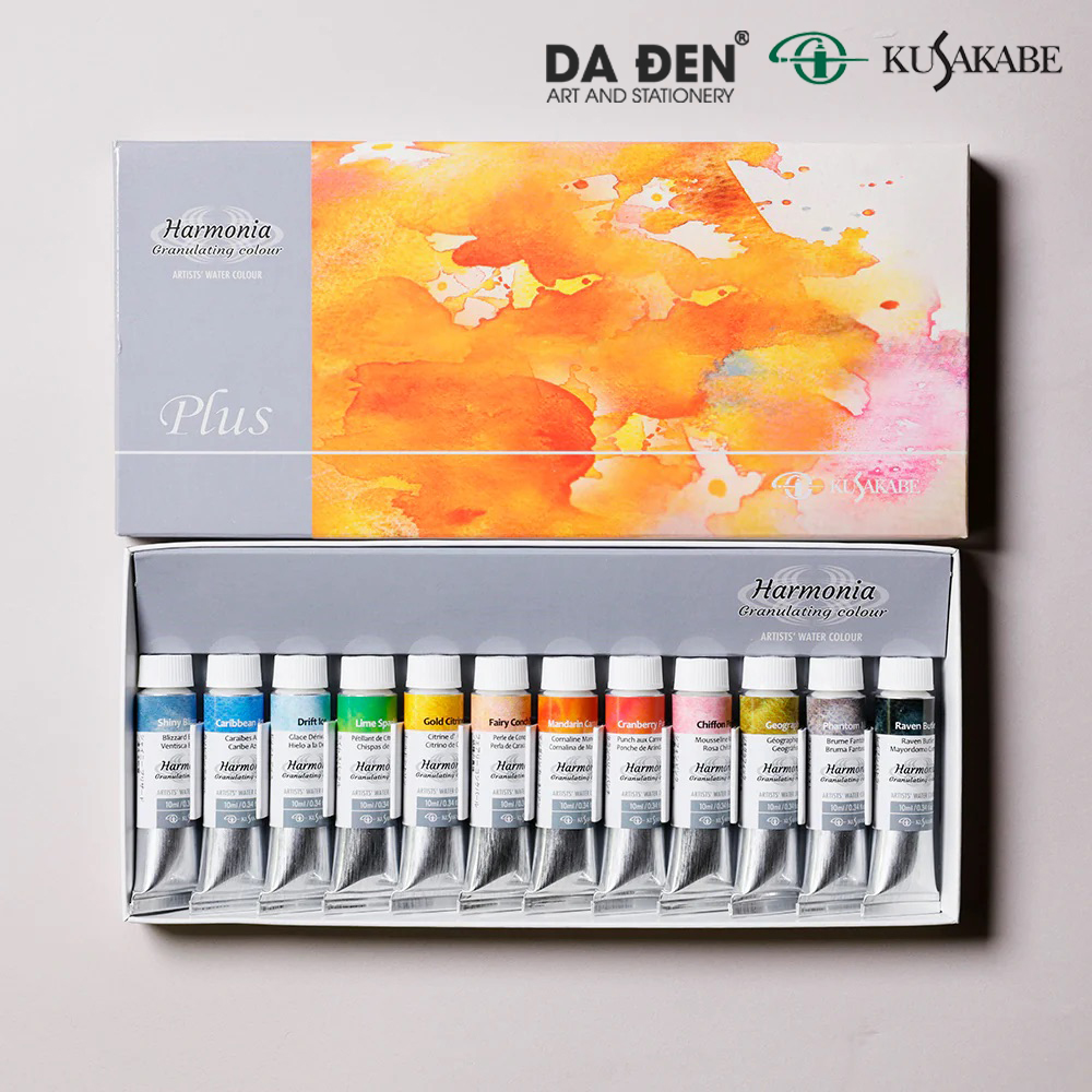 Harmonia – Granulating Watercolor Plus là dòng màu nước hiệu ứng hạt (granulating) cao cấp, được phát triển để tạo nên bề mặt màu sống động, chiều sâu tự nhiên và cấu trúc hạt rõ nét khi khô.