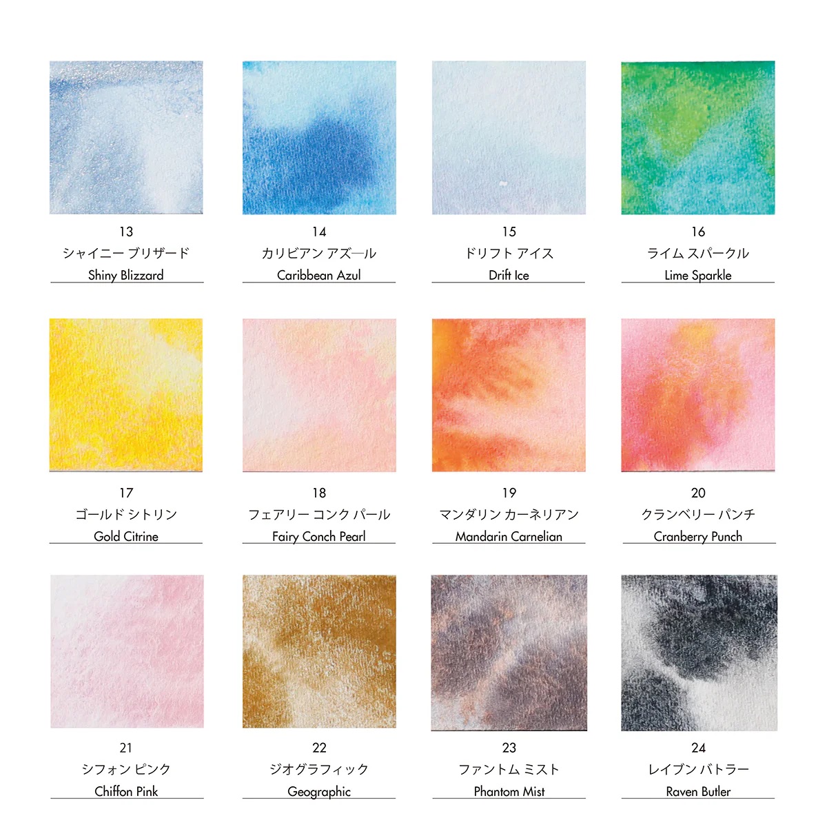 13 Shiny Blizzard, 14 Caribbean Azure, 15 Drift Ice, 16 Lime Sparkle, 17 Gold Citrine, 18 Fairy Conch Pearl, 19 Mandarin Carnelian, 20 Cranberry Punch, 21 Chiffon Pink, 22 Geographic, 23 Phantom Mist, 24 Raven Butler